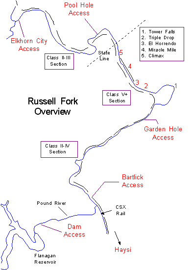 The Pool Hole River access is located on Rte 80, approximately 2 miles east of Elkhorn City (if you hit the Virginia state line, you've gone way too far).